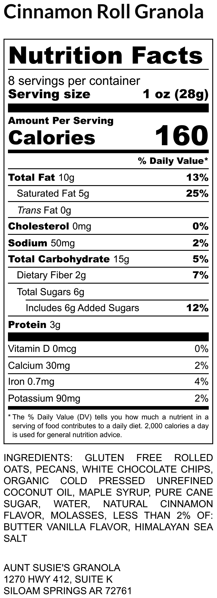Our Cinnamon Roll Granola is a healthy twist on the baked good we all know and love! With cinnamon, maple syrup, molasses, and white chocolate chips mixed in as the icing on top, this treat is sure to impress!